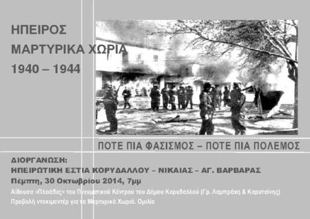 Εκδήλωση της Ηπειρώτικης Εστίας Κορυδαλλού-Νίκαιας-Αγ.Βαρβάρας για τα Μαρτυρικά χωριά στην Ήπειρο, με αφορμή την επέτειο της 28ης Οκτωβρίου την Πέμπτη, 30 Οκτωβρίου 2014, ώρα 19.00΄, στην αίθουσα "Πλειάδες" του Δήμου Κορυδαλλού (Γρ. Λαμπράκη και Καρυταίνης),