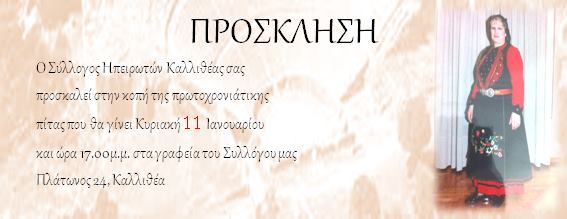 Κοπή Πίτας του Συλλόγου Ηπειρωτών Καλλιθέας, την Κυριακή 11 Ιανουαρίου 2015, ώρα 17.00΄ στα... Κοπή Πίτας του Συλλόγου Ηπειρωτών Καλλιθέας, την Κυριακή 11 Ιανουαρίου 2015, ώρα 17.00΄ στα γραφεία του, Πλάτωνος 44, ΚαλλιθέαTweet Προηγούμενο Επόμενο