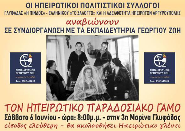 Αναβίωση του Ηπειρώτικου παραδοσιακού γάμου, το Σάββατο 6 Ιουνίου 2015, ώρα 20.00' στην 3η μαρίνα Γλυφάδας, από τους Συλλόγους Ηπειρωτών Αργυρούπολης, Γλυφάδας και Ελληνικού