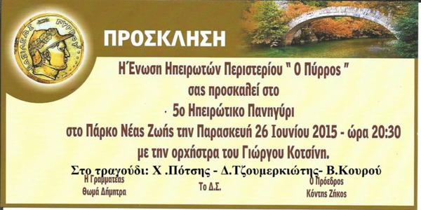 Ηπειρώτικο πανηγύρι της Ένωσης Ηπειρωτών Περιστερίου, τη Παρασκευή 26 Ιουνίου 2015, ώρα 20.30' στο... Ηπειρώτικο πανηγύρι της Ένωσης Ηπειρωτών Περιστερίου, τη Παρασκευή 26 Ιουνίου 2015, ώρα 20.30' στο Πάρκο Νέας Ζωής στο Περιστέρι.Tweet Προηγούμενο Επόμενο