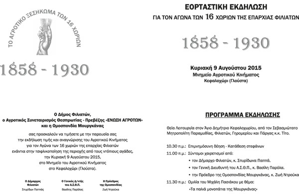 Εκδήλωση τιμής και αναγνώρισης του Αγροτικού Κινήματος και του Αγώνα των 16 χωριών της Μουργκάνας, την Κυριακή 9 Αυγούστου 2015, ώρα 10.30', στο Μνημείο του Αγροτικού Κινήματος στο Κεφαλοχώρι (Γλούστα) Θεσπρωτίας