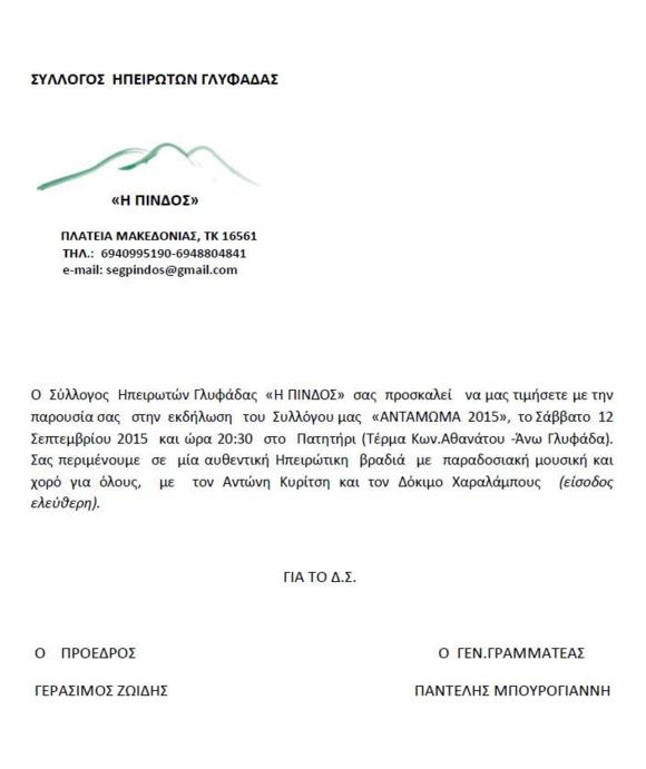 Ο Σύλλογος Ηπειρωτών Γλυφάδας, διοργανώνει το Ηπειρώτικο Αντάμωμα 2015, το Σάββατο 12 Σεπτεμβρίου 2015, ώρα 20.30', στo Πατητήρι, τέρμα Κων.Αθανάτου, Άνω Γλυφάδα.