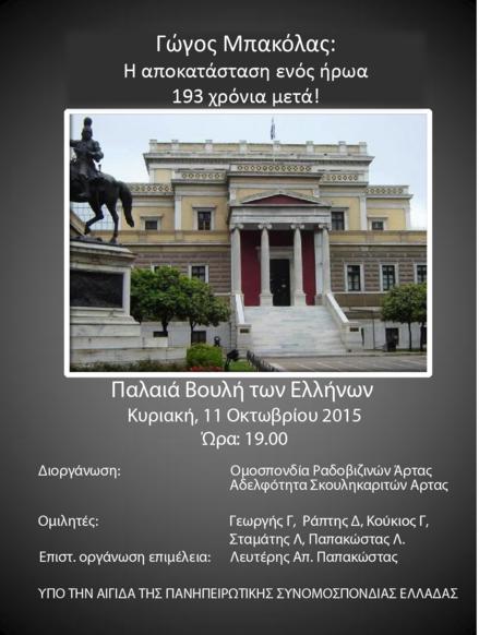 Στο κτίριο της Παλαιάς Βουλής των Ελλήνων (οδός Σταδίου αρ. 15) θα πραγματοποιηθεί την Κυριακή 11 Οκτωβρίου 2015, ώρα 19.30', εκδήλωση - επιστημονική ημερίδα με θέμα:Γώγος Μπακόλας.Η αποκατάσταση ενός ήρωα 193 χρόνια μετά.