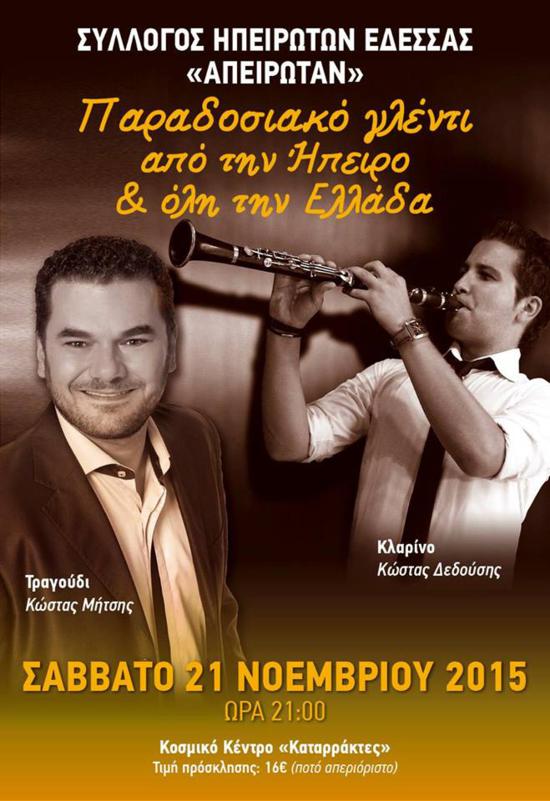 Ο Σύλλογος Ηπειρωτών 'Εδεσσας καλεί τους Ηπειρώτες και τους φίλους της Ηπείρου, στην Πέλλα και τη Δυτική Μακεδονία να ανταμώσουν και διασκεδάσουν ηπειρώτικα, το Σάββατο 21 Νοεμβρίου 2015, ώρα 21.00' στο κέντρο ''Καταρράκτες'', στην Έδεσσα