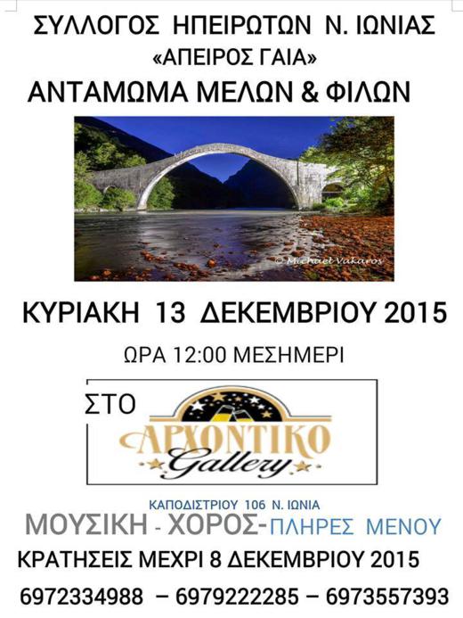 Ο Σύλλογος Ηπειρωτών Νέας Ιωνίας Αττικής, διοργανώνει ηπειρώτικο αντάμωμα μελών και φίλων, την Κυριακή 13 Δεκεμβρίου 2015, ώρα 12.00' το μεσημέρι, στο ''Αρχοντικό Gallery'', Καποδιστρίου 106, Νέα Ιωνία