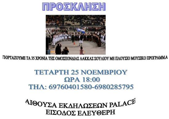 Η Ομοσπονδία Ηπειρωτών Λάκκας Σουλίου, καλεί τα μέλη της, τους φίλους της, τους Ηπειρώτες και τους φίλους της Ηπείρου και της παράδοσης να γιορτάσουμε μαζί, την Τετάρτη 25 Νοεμβρίου 2015, ώρα 18.00' στο κέντρο XALKIAS PALLAS, Ψαρών 4, πλατεία Καραϊσκάκη, στο Μεταξουργείο, τα 36 χρόνια δράσης και λειτουργίας της Ομοσσπονδία;.