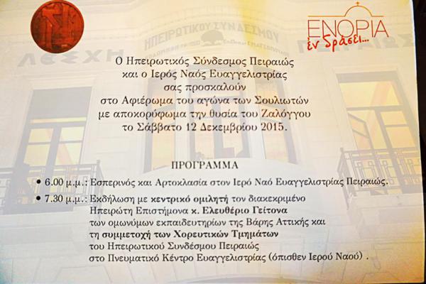 Ο Ηπειρωτικός Σύνδεσμος Πειραιά διοργανώνει αφιέρωμα στον αγώνα των Σουλιωτών και τη θυσία του Ζαλόγγου, το Σάββατο 12 Δεκεμβρίου 2015, ώρα 18.00'