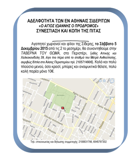 Συνεστίαση της Αδελφότητας Σιδεριτών Θεσπρωτίας, το Σάββατο 5 Δεκεμβρίου 2015 από τις 2 το μεσημέρι, στην Ταβέρνα του Θωμά, (οδός Αττικής και Χαλκοκονδύλη 39, δίπλα στο Άλσος Περιστερίου).