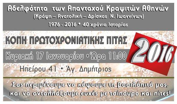 H Aδελφότητα απανταχού Κραψιτών Αθήνας, κόβει τη Πίτα της, την Κυριακή 17 Ιανουαρίου 2016, ώρα 11.00', στο οίκημα της, Ηπείρου 41, Άγιος Δημήτριος (Μπραχάμι) Αττικής