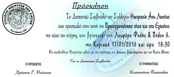 Ο Σύλλογος Ηπειρωτών Άνω Λιοσίων εγκαινιάζει τη νέα στέγη του,στη Λεωφόρο Φυλής και Πύλου 6, στα Άνω Λιόσια, κόβει την πίτα του και διασκεδάζει, την Κυριακή 17 Ιανουαρίου 2016 και ώρα 18.30'