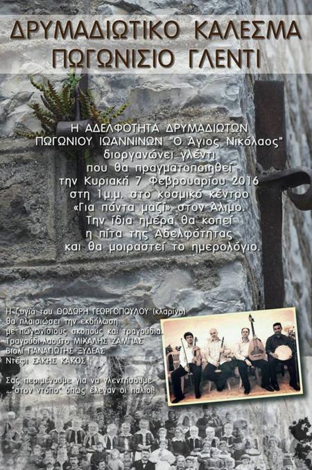 Η Αδελφότητα Δρυμαδιωτών Πωγωνίου Αθήνας διοργανώνει Πωγωνήσιο γλέντι, την Κυριακή 7 Φεβρουαρίου 2016, ώρα 13.00', στο κέντρο ''Για πάντα μαζί'', Χαρ. Τρικούπη 23 και Μαυρομιχάλη, Άλιμος