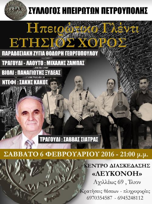 Ο Σύλλογος Ηπειρωτών Πετρούπολης σας προσκαλεί στον ετήσιο χορό και την κοπή της πρωτοχρονιάτικης πίτας του, το Σάββατο 6 Φεβρουαρίου και ώρα 21:00 στο κοσμικο κέντρο '' ΛΕΥΚΟΝΟΗ '' Αχιλλέως 69, Ίλιον. Ένα μεγάλο και γνήσιο ηπειρώτικο γλέντι με την συνάντηση της παραδοσιακής ζυγιάς του Θοδωρή Γεωργόπουλου και του μεγάλου Σάββα Σιάτρα θα μας σεργιανίσουν σε όλη την Ήπειρο μαζί με τα χορευτικά τμήματα του συλλόγου μας.