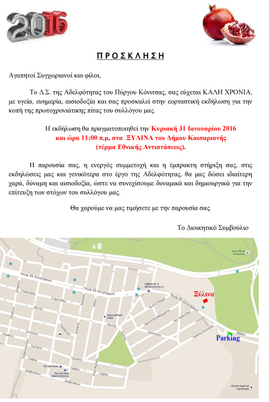 Η Αδελφότητα Πύργου(Στράτσιανη) Κόνιτσας κόβει την Πίτα της, την Κυριακή 31 Ιανουαρίου 2016, ώρα 11.00' στα Ξύλινα του Δήμου Καισαριανής, τέρμα Εθνικής Αντίστασης