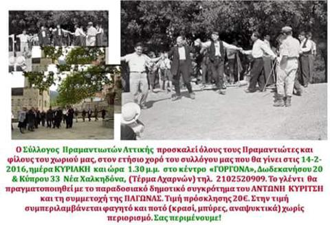 Ο Σύλλογος Πραμαντιωτών Αττικής, ανταμώνει και διασκεδάζει, την Κυριακή 14 Φεβρουαρίου 2016, ώρα 13.30', στο κέντρο ''Γοργόνα'', Δωδεκανήσου 20 και Κύπρου, Νέα Χαλκηδώνα