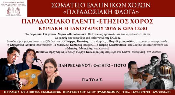 Το Σωματείο Ελληνικών Χορών '' Παραδοσιακή Φλόγα '' σας προσκαλεί στο Αθλητικό Πολυκέντρο Ραδιοφωνίας στο Ίλιον στο μεγαλύτερο παραδοσιακό γλέντι της Αθήνας για το 2016. Κυριακή 31 Ιανουαρίου & ώρα 12:30 σας περιμένουμε για ένα ταξίδι σε όλη την Ελλάδα με πολύ χορό και τραγούδι. Συνοδοιπόροι μας κορυφαίοι μουσικοί της παράδοσης μας: