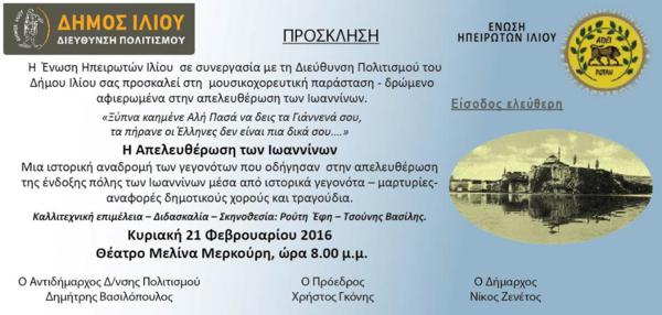 Η Ένωση Ηπειρωτών Ιλίου σε συνεργασία με τη Διεύθυνση Πολιτισμού του Δήμου Ιλίου σας προσκαλεί στην μουσικοχορευτική παράσταση-δρώμενο αφιέρωμα στην απελευθέρωση των Ιωαννίνων. Μια ιστορική αναδρομή των γεγονότων που οδήγησαν στην απελευθέρωση της ένδοξης πόλης των Ιωαννίνων μέσα από ιστορικά γεγονότα – μαρτυρίες - αναφορές , δημοτικούς χορούς και τραγούδια.