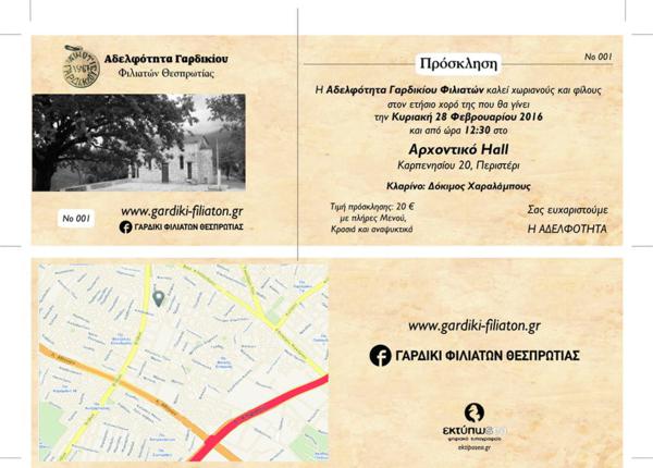 Η Αδελφότητα Γαρδικιωτών Φιλιατών Θεσπρωτίας, ανταμώνει και διασκεδάζει, την Κυριακή 28 Φεβρουαρίου 2016, ώρα 12.30', στο ''Αρχοντικό Hall'', Καρπενησίου 20, Περιστέρι