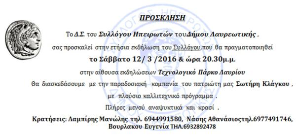 O Σύλλογος Ηπειρωτών Λαυρεωτικής ανταμώνει και διασκεδάζει το Σάββατο 12 Μαρτίου 2016, ώρα 20.30', στην αίθουσα εκδηλώσεων του τεχνολογικού πάρκου Λαυρίου