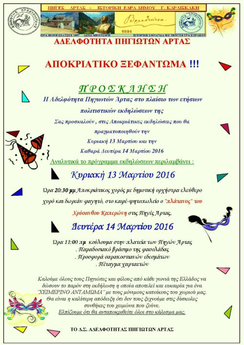 Αδελφότητα Πηγιωτών Άρτας-Αποκριάτικες Εκδηλώσεις 13 και 14 Μαρτίου 2016