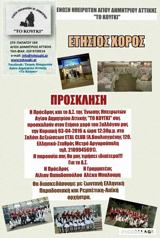 Ηπειρώτικο αντάμωμα και γλέντι, του Συλλόγου Αγίου Δημητρίου Αττικής ''Το Κούγκι'', την Κυριακή 3 Απριλίου 2016, ώρα 12.30', στο ETAL CLUB, Λ. Βουλιαγμένης 120, Σταθμός Μετρό Αργυρούπολης