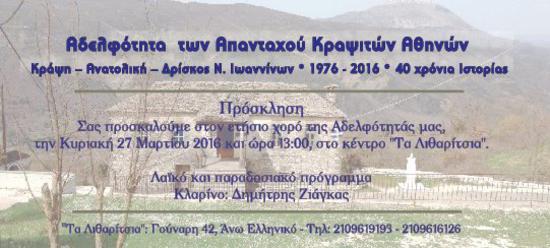 Η Αδελφότητα Κραψιτών Αθήνας ανταμώνει, την Κυριακή 27 Μαρτίου 2016, ώρα 13.00', στο Κέντρο ''Λιθαρίτσια'', Γούναρη 42, Άνω Ελληνικό
