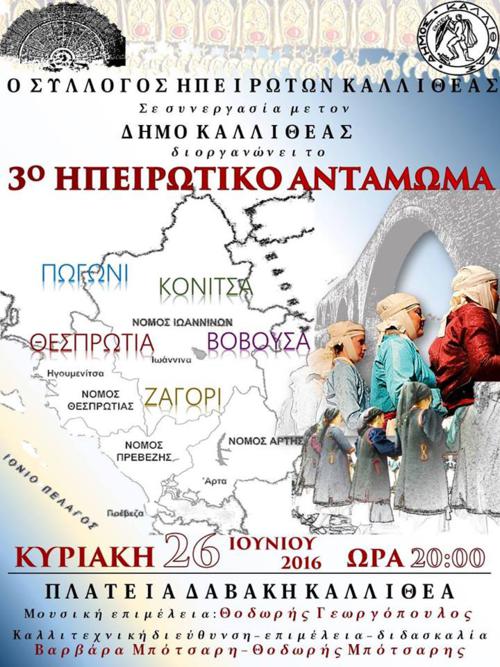 Ο Σύλλογος Ηπειρωτών Καλλιθέας διοργανώνει για τρίτη συνεχή χρονιά το καθιερωμένο θεσμό του καλοκαιριού το "Ηπειρώτικο Αντάμωμα", την Κυριακή 26 Ιουνίου 2016, ώρα 20.00', στην πλατεία Δαβάκη Καλλιθέας .