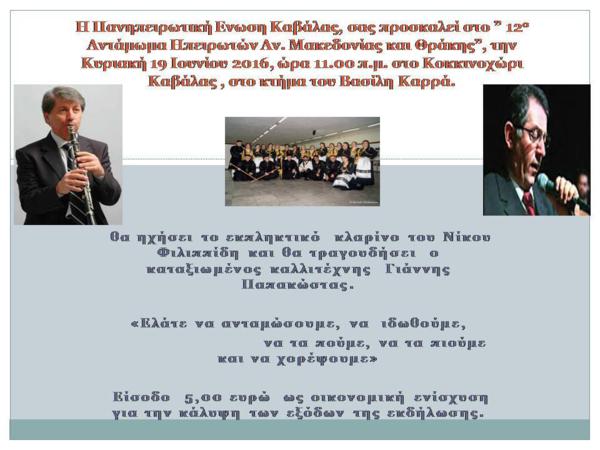 Η Πανηπειρωτική Ένωση Νομού Καβάλας , μαζί με τους Συλλόγους Ηπειρωτών Δράμας, Σερρών, Κομοτηνής, Εβρου, Χρυσούπολης , Ξάνθης, Κατερίνης , Μερακλήδες Αρτας σας προσκαλούμε στο 12ο Αντάμωμα των Ηπειρωτών Αν. Μακεδονίας & Θράκης.
