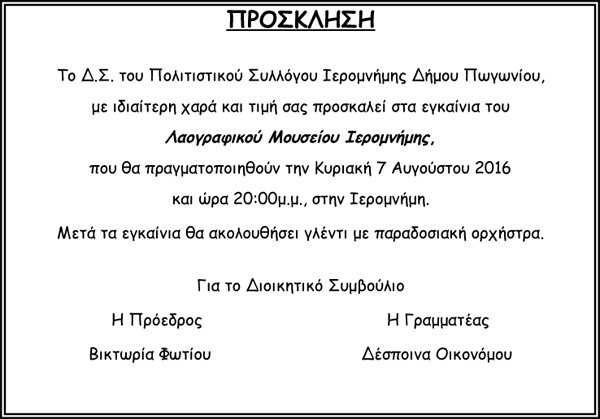 Πολιτιστικός Σύλλογος Ιερομνήμης Πωγωνίου.Πρόσκληση στα εγκαίνια του Λαογραφικού Μουσείου την Κυριακή
