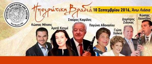 Ο Σύλλογος Ηπειρωτών Άνω Λιοσίων διοργανώνει Ηπειρώτικη βραδιά, το Σάββατο 10 Σεπτεμβρίου 2016, ώρα 21.00',