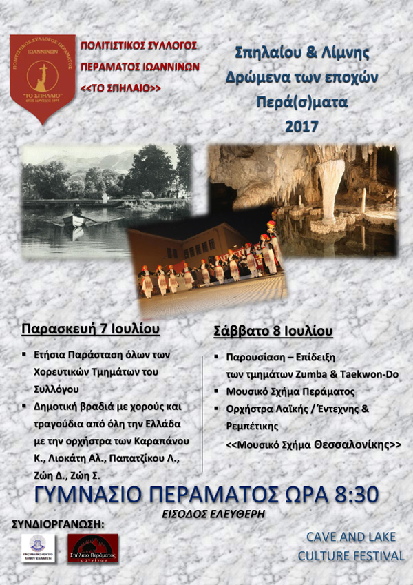 Ετήσια Κεντρική εκδήλωση του "Σπηλαίου και Λίμνης Δρώμενα Περά(σ)ματα στο χρόνο...." την 7,8 Ιουλίου 2017.Σας αποστέλλω την αφίσα καθώς και το πρόγραμμα της σε συνημμένη μορφή ώστε να δημοσιεύσετε την εκδήλωση προς ενημέρωση του κοινού.