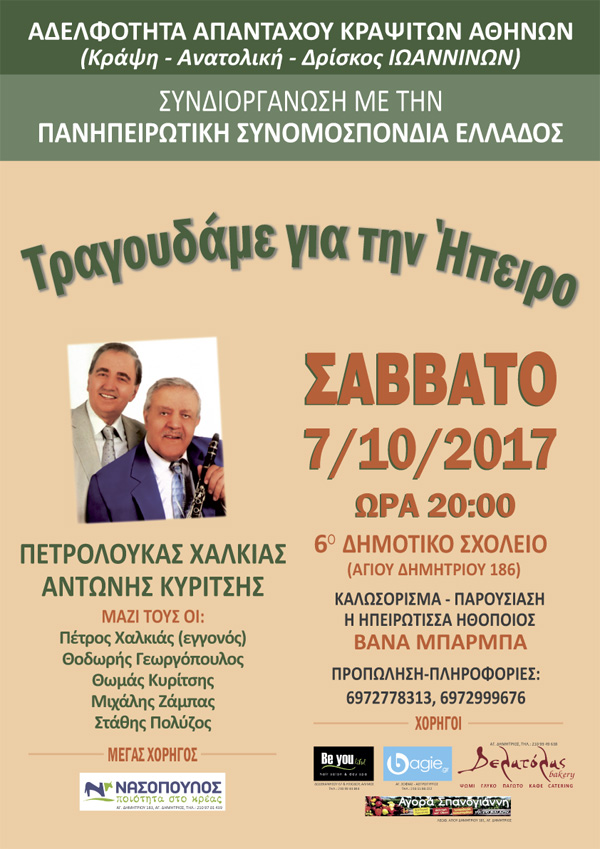 που συνδιοργανώνουν η Πανηπειρωτική Συνομοσπονδία Ελλάδος και η Αδελφότητα Κραψιτών Αθήνας, το Σάββατο 7 Οκτωβρίου 2017, ώρα 20.00', στο 6ο Δημοτικό Σχολείο Αγίου Δημητρίου, Αγίου Δημητρίου 186, πλατεία Βελουχιώτη.