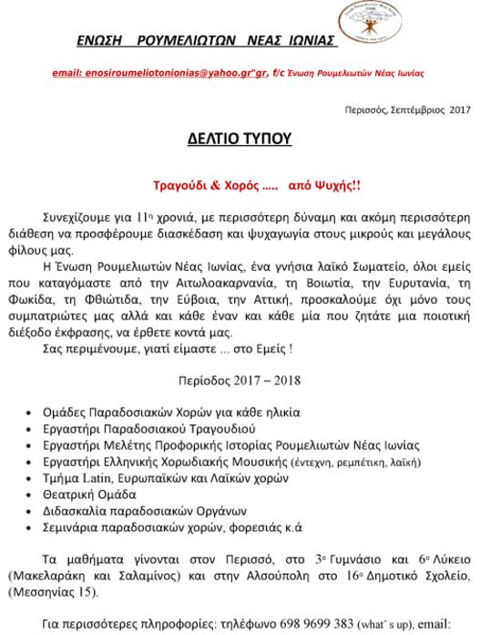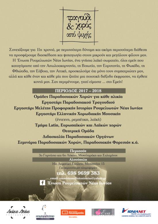Ένωση Ρουμελιωτών Νέας Ιωνίας: Έναρξη Χορευτικών Τμημάτων Περιόδου 2017-2018