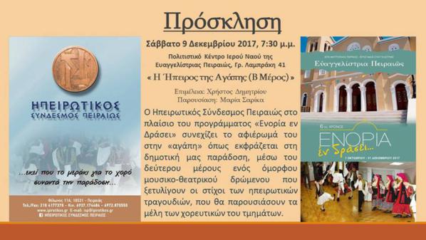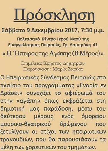 Ηπειρωτικός Σύνδεσμος Πειραιά. ''Η ΄Ηπειρος της αγάπης''. Μουσικοχορευτικό και θεατρικό δρώμενο, το