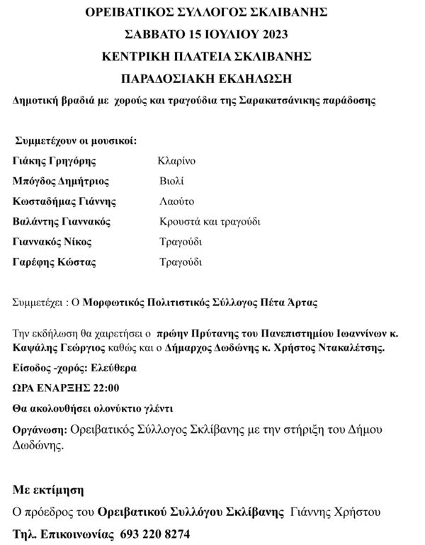 Παραδοσιακή Εκδήλωση το Σάββατο 15 Ιουλίου 2023.