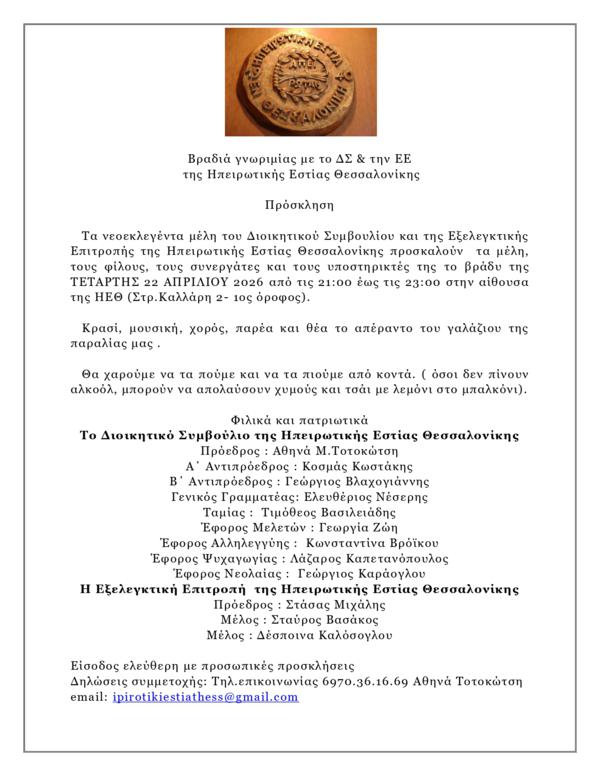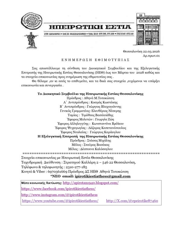 ''Ηπειρώτικη Εστία Θεσσαλονίκης''. Ενημέρωση Εθιμοτυπίας 22 Απριλίου 2026...
