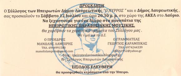 O Σύλλογος Ηπειρωτών Λαυρεωτικής, διοργανώνει την μουσικοχορευτική εκδήλωση ''Στα μονοπάτια της Ηπειρώτικης παραδοσιακής μουσικής'', το Σάββατο 12 Ιουλίου 2014, ώρα 20.30' στο χώρο ΑΚΕΛ Λαυρίου