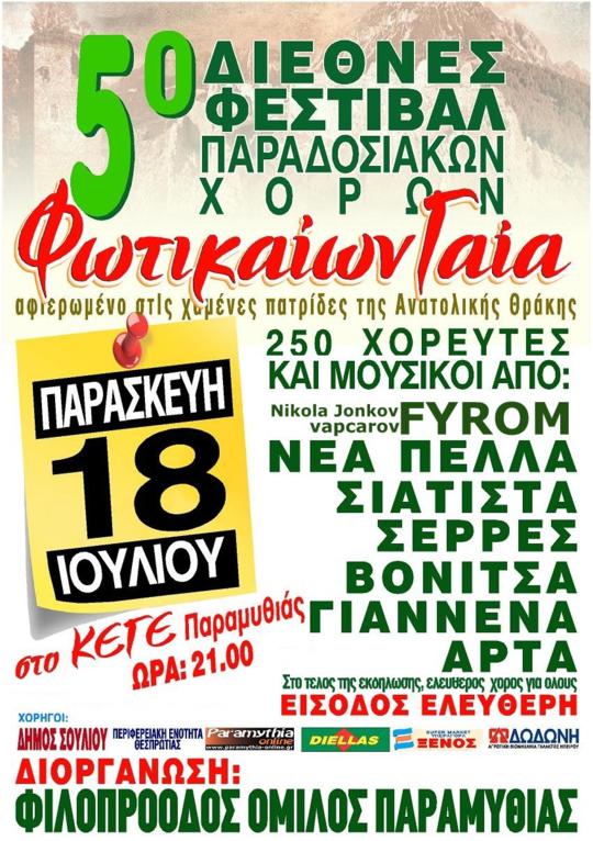 Με Βαλκανικές μουσικές και χορούς από FYROM, Πέλλα, Σέρρες, Σιάτιστα, Βόνιτσα, Γιάννενα, Άρτα κ.α θα πλημμυρίσει η Παραμυθιά την Παρασκευή 18 Ιουλίου, όπου και πραγματοποιηθεί το 5ο Διεθνές Φεστιβάλ Παραδοσιακών Χορών "Φωτικαίων Γαία" του Φιλοπρόοδου Ομίλου Παραμυθιάς.