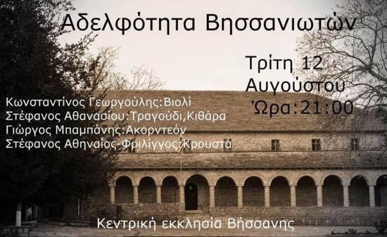 Η Αδελφότητα Βησσανιωτών Αθήνας διοργανώνει μουσική βραδιά την Τρίτη 12 Αυγούστου 2014, ώρα 21:00', στην... Η Αδελφότητα Βησσανιωτών Αθήνας διοργανώνει μουσική βραδιά την Τρίτη 12 Αυγούστου 2014, ώρα 21:00', στην εκκλησία της Βήσσανης Tweet Προηγούμενο Επόμενο