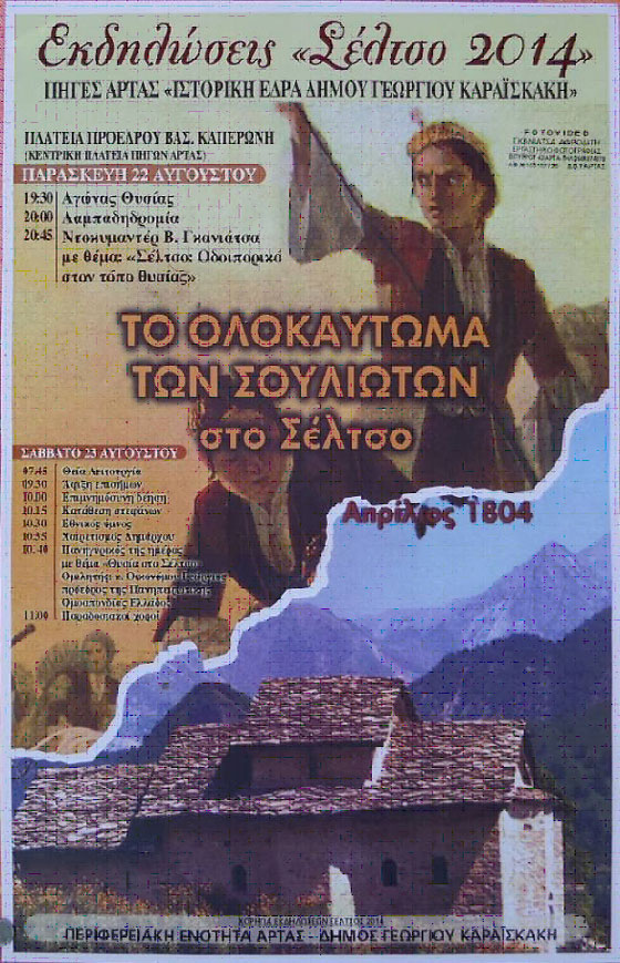 Στις Πηγές Άρτας - Ιστορική έδρα του δήμου Γ. Καραϊσκάκη και στην πλατεία Β. Καπερώνη -κεντρική πλατεία Πηγών- ο δήμος Γ. Καραϊσκάκη στο πλαίσιο των εορταστικών εκδηλώσεων ΄΄ΣΕΛΤΣΟ 2014΄΄ διοργανώνει διήμερο αφιέρωμα για τα 210 χρόνια από την Θυσία –Ολοκαύτωμα των ΣΟΥΛΙΩΤΏΝ στο Σέλτσο το 1804.