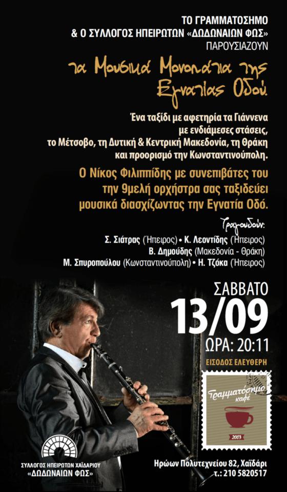 Αγαπητοί πατριώτες και φίλοι, ο σύλλογος Ηπειρωτών Χαϊδαρίου σε συνεργασία με το καφέ Γραμματόσημο οργανώνουν μια πολύ όμορφη εκδήλωση στην πλατεία του Δάσους Χαϊδαρίου στο χώρο του « Γραμματόσημου» με μουσικό ταξίδι δια μέσω της Εγνατίας από τα Γιάννενα στη Κωνσταντινούπολη.