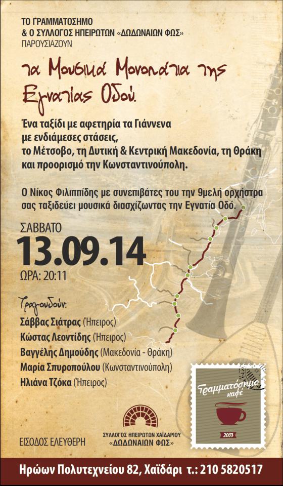 Ο Σύλλογος Ηπειρωτών Χαϊδαρίου ''Δωδωναίων Φως'', παρουσιάζει τα Μουσικά Μονοπάτια της Εγνατίας οδού. το Σάββατο 13 Σεπτεμβρίου 2014, ώρα 21.30΄ στην Πλατεία Χαϊδαρίου, στο Καφέ Γραμματόσημο, Ηρώων Πολυτεχνείου 12, Χαϊδάρι.