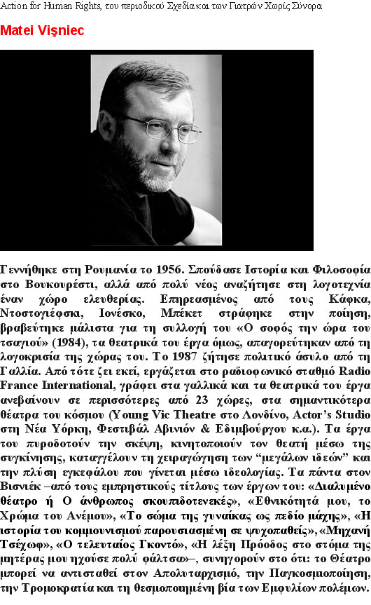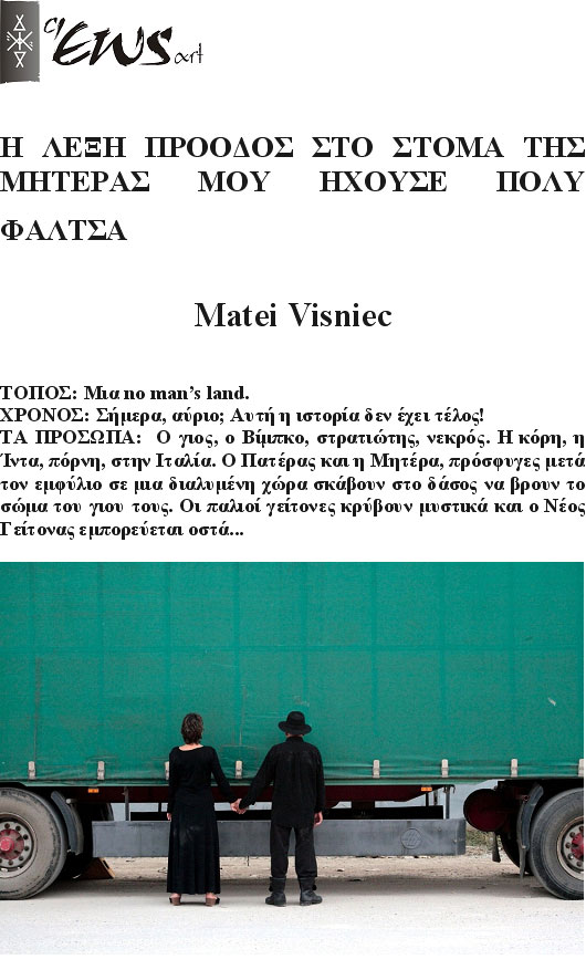 Γκροτέσκο, σουρεαλιστικό, αλλόκοτο και ονειρικό το έργο του Ρουμάνου συγγραφέα ΜΑΤΕΪ ΒΙΣΝΙΕΚ προκαλεί γέλιο και συγκίνηση, καταγράφοντας τη ζωή σε ζωντανή μετάδοση.
