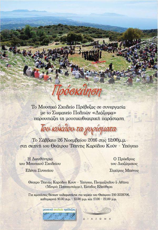 Το Μουσικό Σχολείο Πρέβεζας σε συνεργασία με το Σωματείο Πολιτών «Διάζωμα»,παρουσιάζει τη μουσικοθεατρική παράσταση «Του κύκλου τα γυρίσματα»,