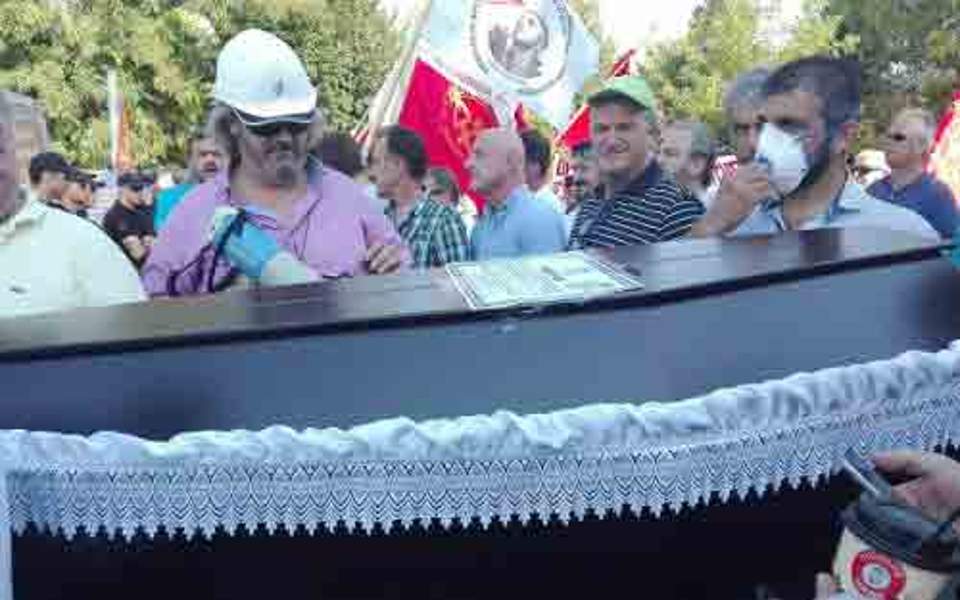 Συνδικαλιστές της ΔΕΗ υποδέχτηκαν τον πρωθυπουργό Αλέξη Τσίπρα, έξω από το Εκθεσιακό Κέντρο στα Κοίλα Κοζάνης, κρατώντας φέρετρο και κηδειόχαρτα στα χέρια.
