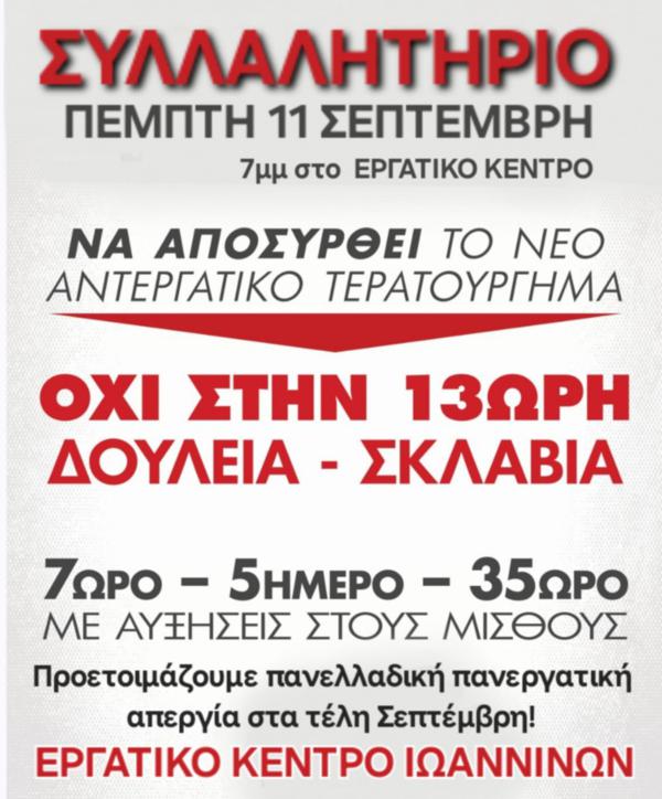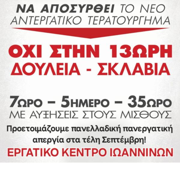 Το νομοσχέδιο τερατούργημα που έφερε η κυβέρνηση για 13ωρη ημερήσια εργασία και βρίσκεται στην διαβούλευση έρχεται να συμπληρώσει τους προηγούμενους αντεργατικούς νόμους, ειδικά τους νόμους Χατζηδάκη-Γεωργιάδη που κατάργησαν το 8ωρο και επέβαλαν 13ωρο (2 εργοδότες) υλοποιώντας τους νόμους και τις κατευθύνσεις της Ευρωπαϊκής Ένωσης (κοινοτική οδηγία από το 2003) που ψήφισαν όλα τα αστικά κόμματα ΝΔ-ΠΑΣΟΚ-ΣΥΡΙΖΑ. Ξήλωσαν και ξηλώνουν δικαιώματα και κατακτήσεις σκληρών αγώνων των τελευταίων δεκαετιών.