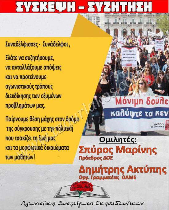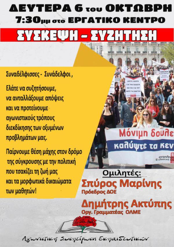 Η Αγωνιστική Συσπείρωση Εκπαιδευτικών καλεί τις Νηπιαγωγούς και τους Δασκάλους, τους Εκπαιδευτικούς όλων των ειδικοτήτων Πρωτοβάθμιας και Δευτεροβάθμιας Εκπαίδευσης σε ΣΥΣΚΕΨΗ - ΣΥΖΗΤΗΣΗ τη Δευτέρα 6/10 στις 7:30μμ στο Εργατικό Κέντρο