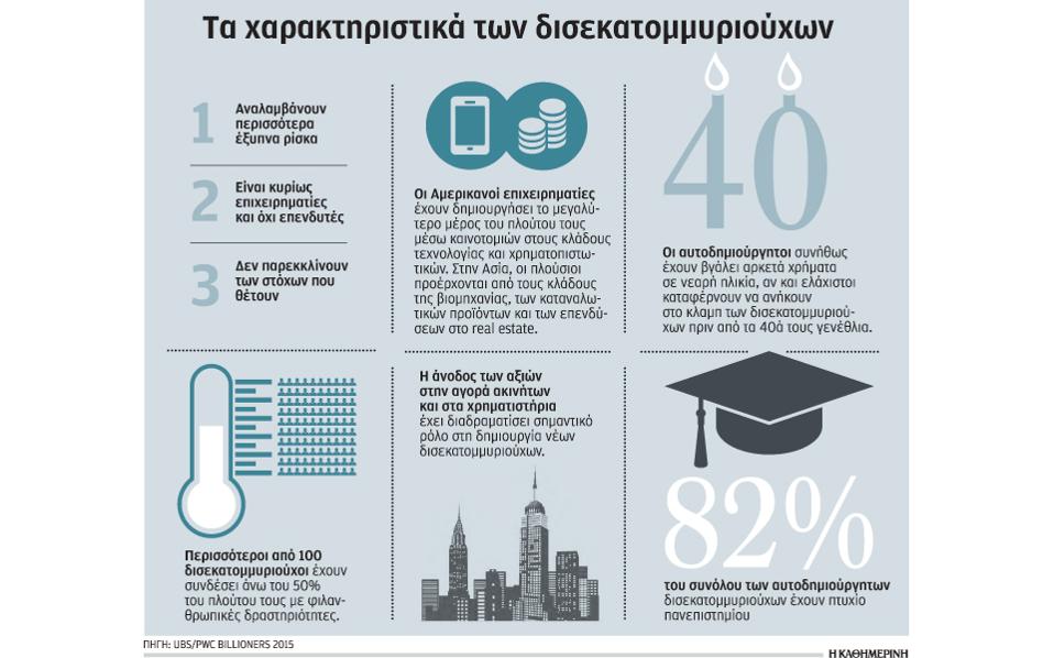 Οι μεγάλες οικονομικές και επιχειρηματικές αλλαγές των τελευταίων 35 ετών έχουν συμβάλει στη δημιουργία δυσθεώρητου πλούτου και στην ανάδειξη μιας νέας τάξης δισεκατομμυριούχων, όπως αναφέρεται σε ευρεία και διαχρονική έρευνα περί πλούτου της UBS και της PricewaterhouseCoppers (PwC). Είναι αυτοδημιούργητοι, 917 τον αριθμό, με περιουσίες που ξεπερνούν τα 3,6 τρισ. δολάρια και οι περισσότεροι προέρχονται από τις Ηνωμένες Πολιτείες, την Ευρώπη κατόπιν και, τέλος, τη Ν. Ασία.