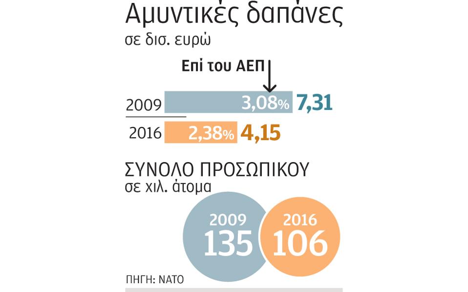 Από τα στοιχεία που παρέχονται προκύπτει ότι οι αμυντικές δαπάνες στην Ελλάδα ακολούθησαν γεωμετρικά καθοδική πορεία από το 2009 έως και το 2014 (από 7,31 δισ. ευρώ το 2009 σε 3,93 δισ. το 2014), όμως υπήρξε και παράλληλη πτώση του ΑΕΠ. Για το 2015 και το 2016 φαίνεται ελαφρά αύξηση, η οποία μπορεί να ερμηνευθεί και ως σταθεροποίηση, στα περίπου 4,15 δισ. ευρώ σε τρέχουσες τιμές. Η ελαφρώς ανοδική πορεία την τελευταία διετία φαίνεται και από τα ποσοστά ετήσιας μείωσης των αμυντικών δαπανών. Το 2010 οι αμυντικές δαπάνες μειώθηκαν κατά 18,94%, το 2011 κατά 17,97%, το 2012 κατά 10,81%, το 2013 κατά 6,41%. Το 2014 σημειώνεται ελαφρά αύξηση 0,72%, ενώ το 2015 καταγράφεται σαφής αύξηση 7,06%. Για το 2016 προβλέπεται οριακή μείωση (0,07%). Η μείωση φαίνεται και στις κατά κεφαλήν δαπάνες για την άμυνα. Από 837 δολάρια ΗΠΑ ανά άτομο το 2009, η σχετική δαπάνη αναμένεται να κλείσει το 2016 στα 537. H μείωση σε σημαντικό βαθμό οφείλεται και στην ανάλογη τάση στον αριθμό του στρατιωτικού προσωπικού από 135.000 άτομα το 2009 σε 106.000 το 2016. Στα ίδια χρόνια παρατηρείται ανισομέρεια στις δαπάνες. Εχουν μειωθεί οι εξοπλιστικές δαπάνες (από 27,75% των ετήσιων αμυντικών δαπανών το 2009 έχουν περιοριστεί στο 14,91% το 2016), ενώ έχουν αυξηθεί οι δαπάνες για μισθούς και συντάξεις (από το 56,52% το 2009 σε 69,93% το 2016)