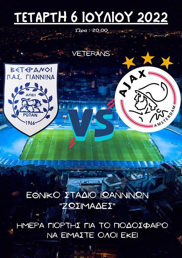 Ο Σύνδεσμος Βετεράνων ποδοσφαιριστών ΠΑΣ ΓΙΑΝΝΙΝΑ διοργανώνει, σε συνεργασία με την Περιφέρεια Ηπείρου τον Δήμο Ιωαννιτών και με επιχειρήσεις της πόλης των Ιωαννίνων, διεθνή φιλικό ποδοσφαιρικό αγώνα, με την αντίστοιχη ομάδα βετεράνων ποδοσφαιριστών της ομάδας AJAX Άμστερνταμ Ολλανδίας, στις 6 Ιουλίου στο Εθνικό στάδιο Ζωσιμάδες στα Ιωάννινα.