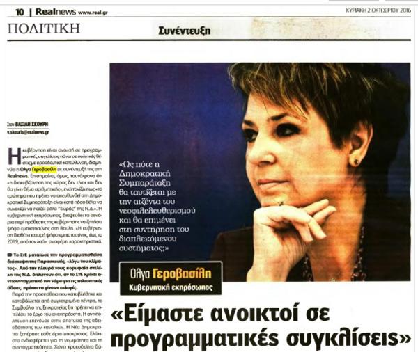 Συνέντευξη της Κυβερνητικής Εκπροσώπου, Όλγας Γεροβασίλη στην εφημερίδα REAL NEWS και στον Δημοσιογράφο Βασίλη Σκουρή